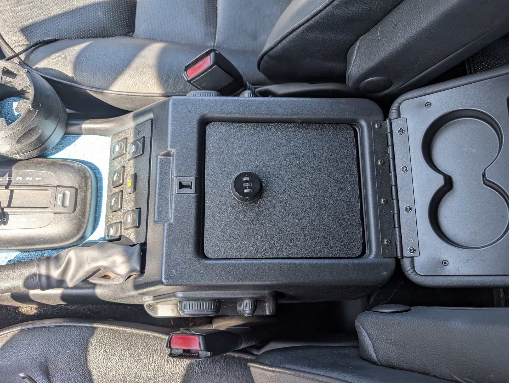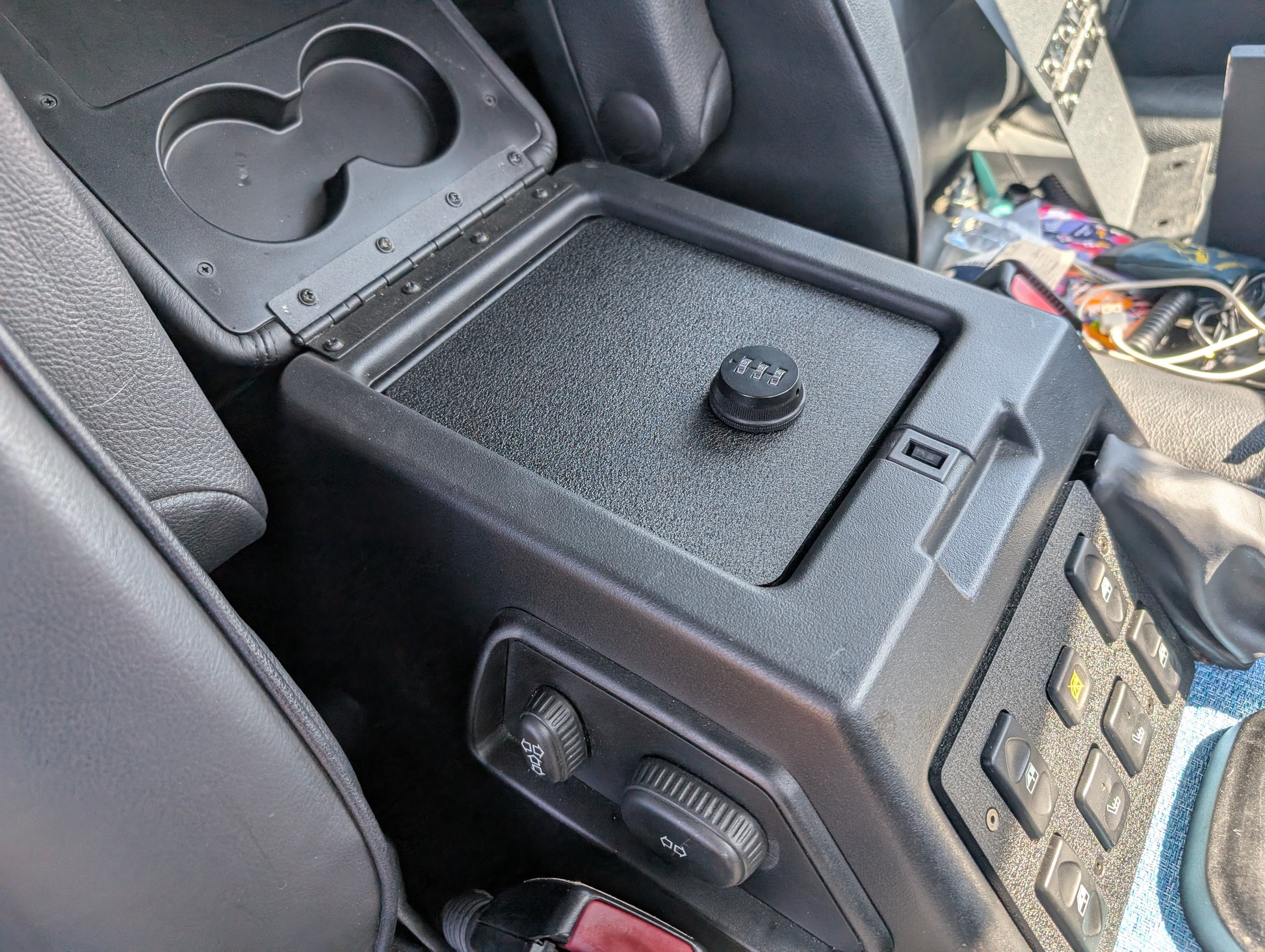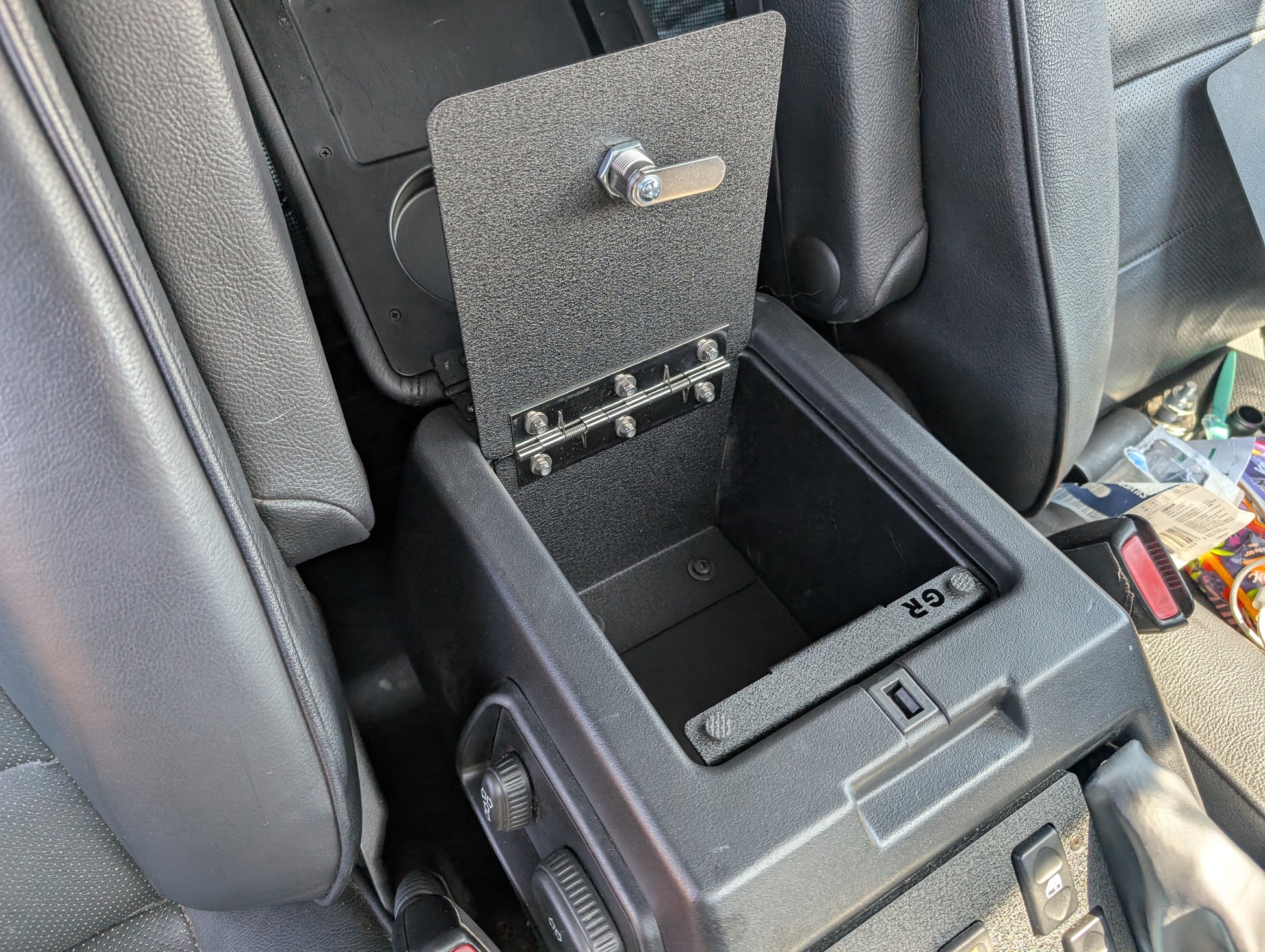 The locking cubby is one of my favorite additions to any disco 2. A Sig 365XL will fit in here if you need to run into school to grab the kids real quick.